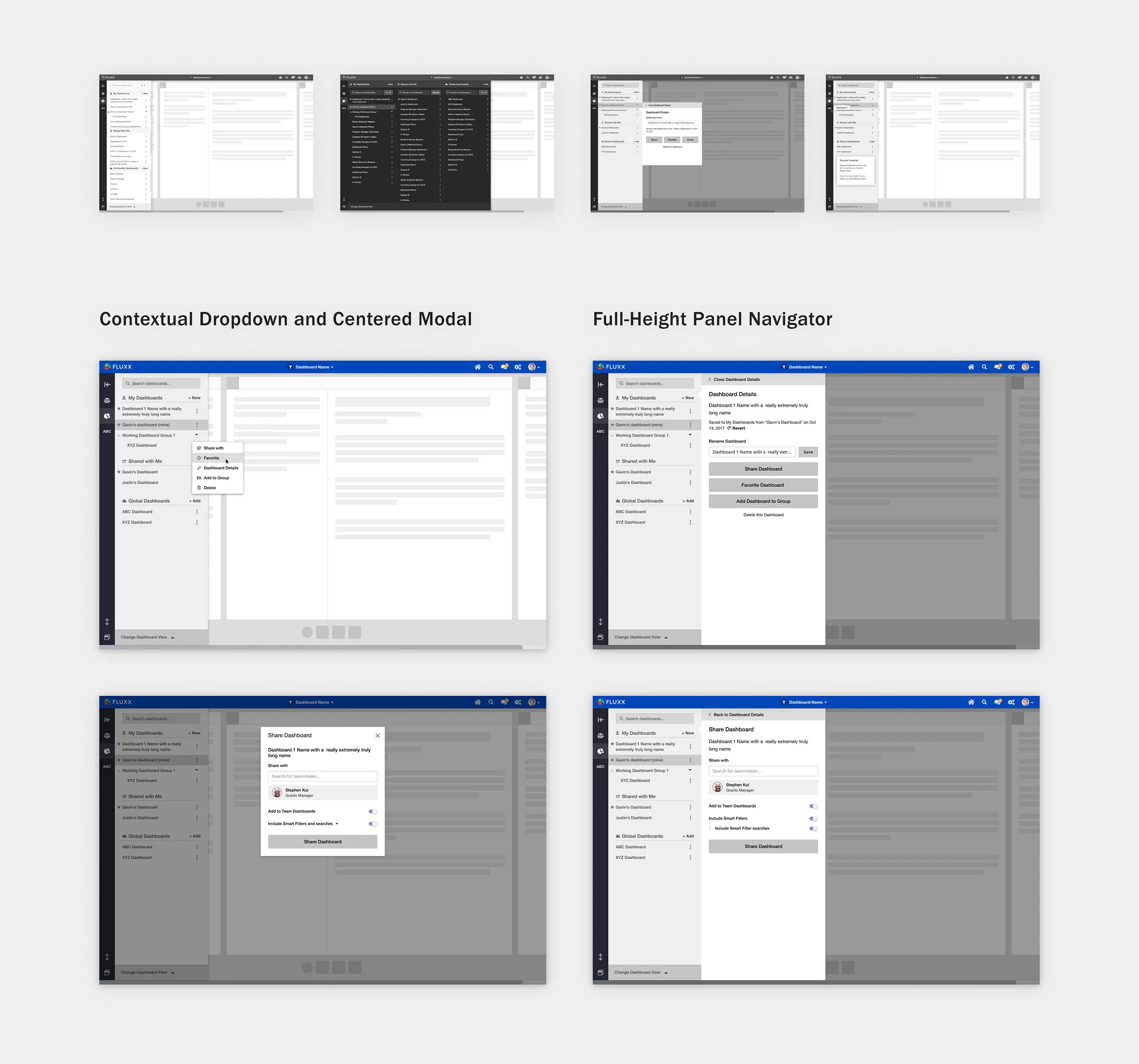 Some test participants were really excited about having a simplified set of actions that the contextual dropdown and modal brought, while others liked having one place to do everything with a Dashboard. At this point, Fluxx’s early switch to Figma 😍 allowed me to rapidly test different approaches to the same functionality through its prototyping prowess.