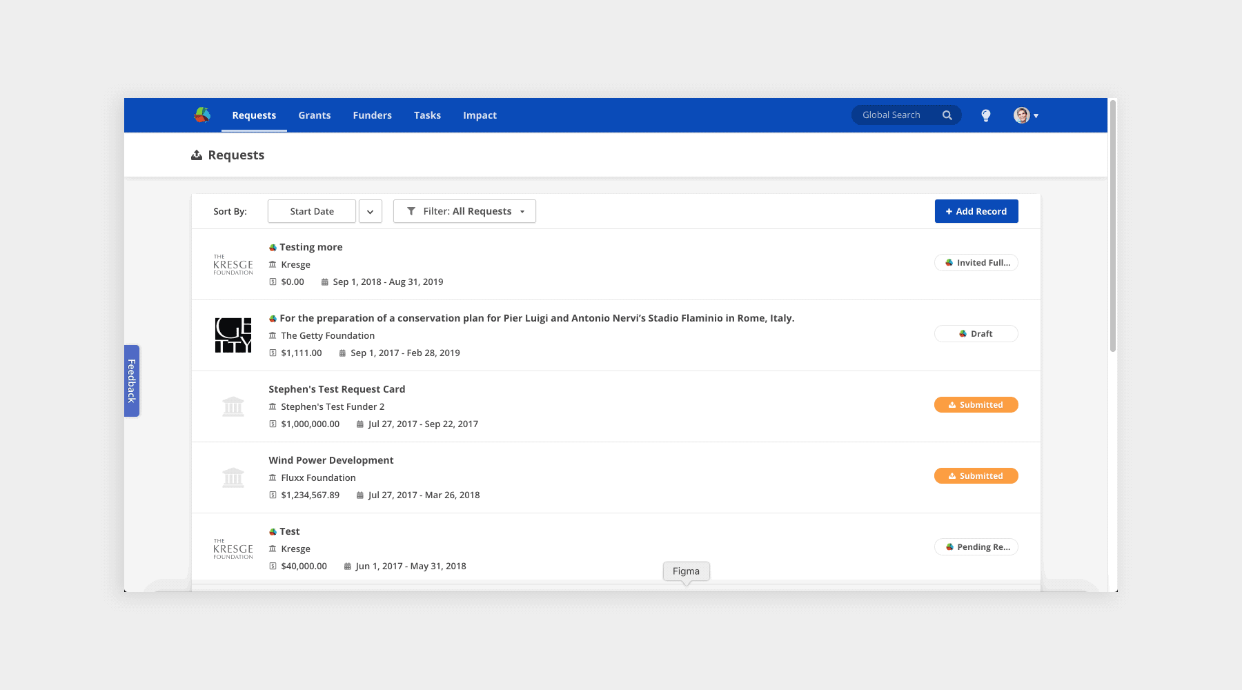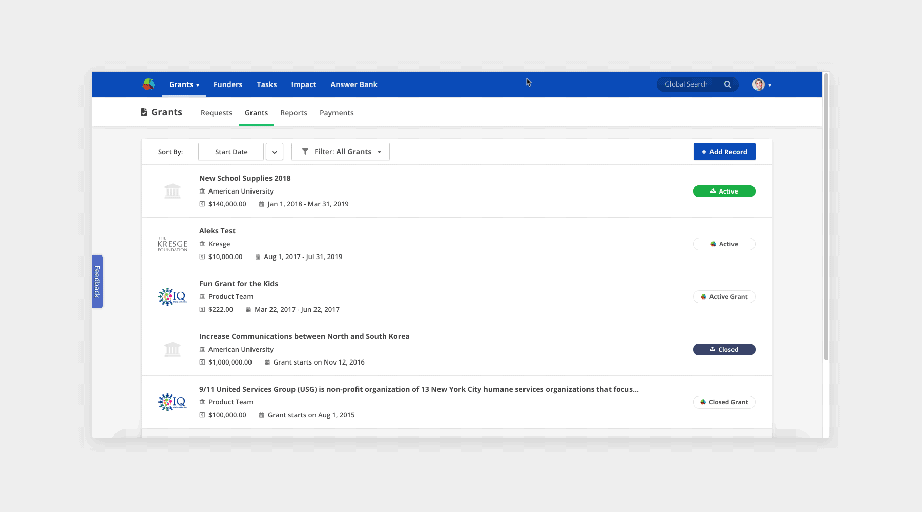 One great example of global form design patterns needing to be adapted to our specific needs was in the pre-filling of default filters. Nonprofits almost exclusively work on to-do aspects of Grants and Requests: Payments due and Reports to complete.