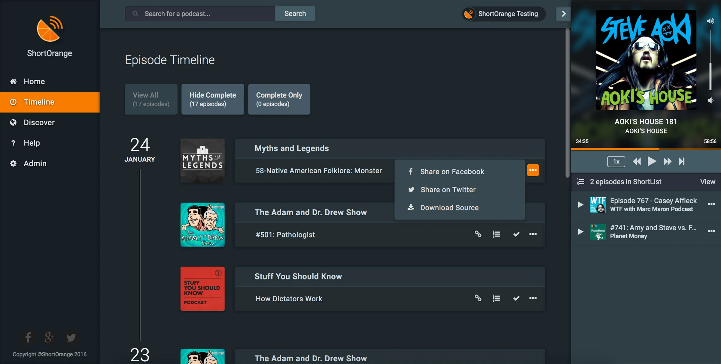 One of my biggest goals with ShortOrange was to make it easier for our registered users to access specifically the episodes they wanted without wasting time or data. Couple this with the fact that a queue and an aggregated view of all podcasts together were two of the most heavily requested features, and the ShortList and Timeline were born. I came up with the name both because "The ShortList" is another riff on the name ShortOrange, but also because it carried the connotation of being part of an exclusive, or selected club.